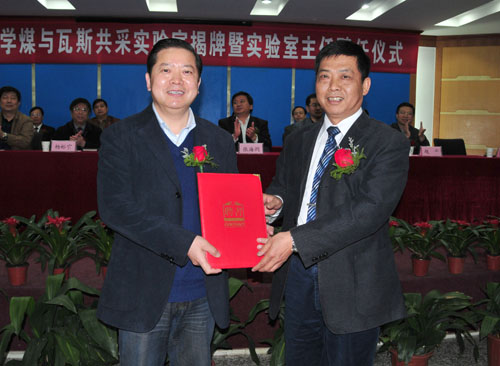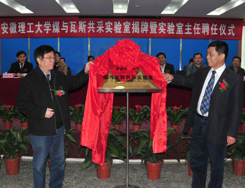 实验室揭牌暨实验室主任授聘仪式上,安徽省经济和信息化委员会副主任张海阁热情致辞,党委书记张明旭发表讲话,校长颜事龙为袁亮颁发聘书,煤炭工业合肥煤炭设计研究院院长杨裕官和颜事龙校长共同为安徽理工大学煤与瓦斯共采实验室揭牌。